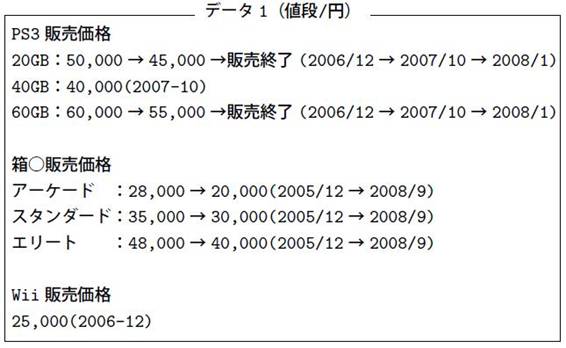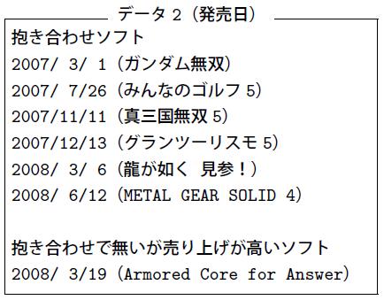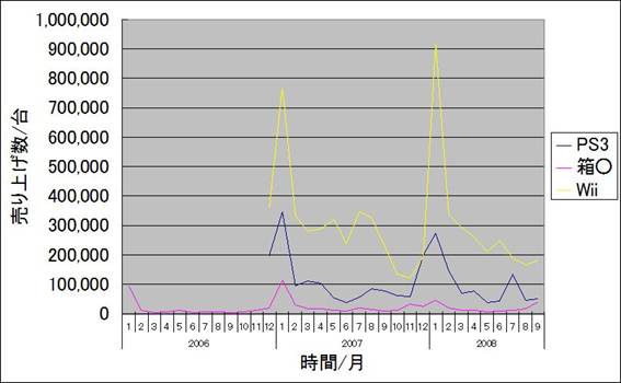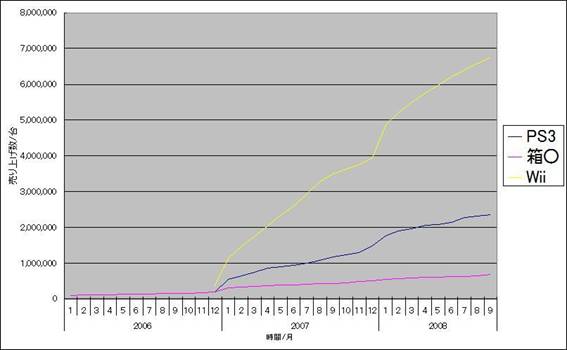 何故このような差ができたのか? まず注目すべき点は発売日の違いである。箱○はPS3、Wii と比べて1 年前に発売されていながら、販売数はあまり伸びていない。この理由は箱○発売時の販売台数がPS2:Xbox = 2 千万:48 万台であるから、Xbox の続編を買おうとする人は少数派であると考えられる。一部ではアイドルマスターなどが反響を呼んでいたが、所詮オタクの人口などたかが知れている。逆に言えば、PS3 の方が売れているのはPS2 を持っているからだと思われる。図2 のグラフは三つとも同じような傾きを取っている。PS3 とWii はときどき他に比べて伸びが大きいときがある。それは主に人気なソフトが発売されたのが大きいと思われる。特にPS3 ではハードとソフトの抱き合わせ商法が多く、データ2 にまとめる。発売日から販売台数の傾きが上がってるのがデータからもわかるつまり、PS3 の場合はある特定のソフトのみが欲しい人が多く、PS3 はついでであることが考えられる。2008 年9 月ではPS3 と箱○が同じくらいの売り上げを出している。これは値下げの効果であることはいうまでも無い。