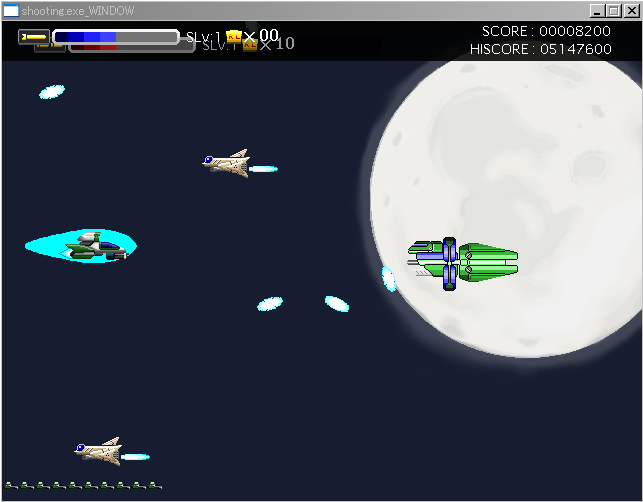 どうも、製作者の長塚です。今回のゲームは正統派横シューティングゲームです。最近になって、シューティング熱が再発し、色んなシューティングをかき集めて、やりつくしてみました。相変わらずヘタレシューターなのは昔から変わりませんが(笑)