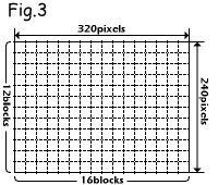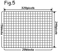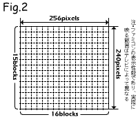 今回最も注意を払ったところです。ファミコンの画面解像度は256×240、1ブロックは16ドットで、1画面に横16ブロック縦14ブロック(Fig.2)入ります。DirectXで設定できる最小は320×240なので、そのまま対応させると画面縁が余ってしまいます。解像度が256×240のままなのに1ブロックが24ドット(Fig.4)で画面が狭くなった感じのあったロックマン7や、320×240なのに1ブロック16ドット(Fig.5)のままだったえ(ピーッ)をプレイして私は違和感を覚えたので、なるべくファミコンシリーズに近い感覚になるように、1ブロック20ドット(Fig.3)として画面に入るブロック数をファミコンと同じ横16ブロックにしました。7